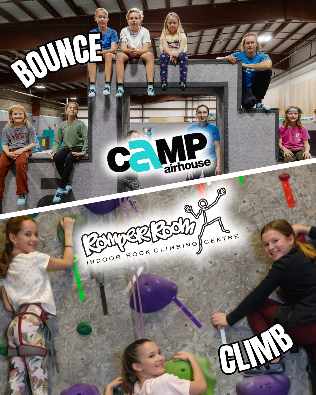 Kids aged 6-12, join us for a week of guided activities and games where campers will make new friends, learn new skills, and build confidence. Participants will begin their day at either Airhouse for trampoline acrobatics, parkour, and skateboarding or at Romper Room for top rope, auto-belay, and boulder cave climbing. Each day after lunch, groups will trade places for a full and diverse day.