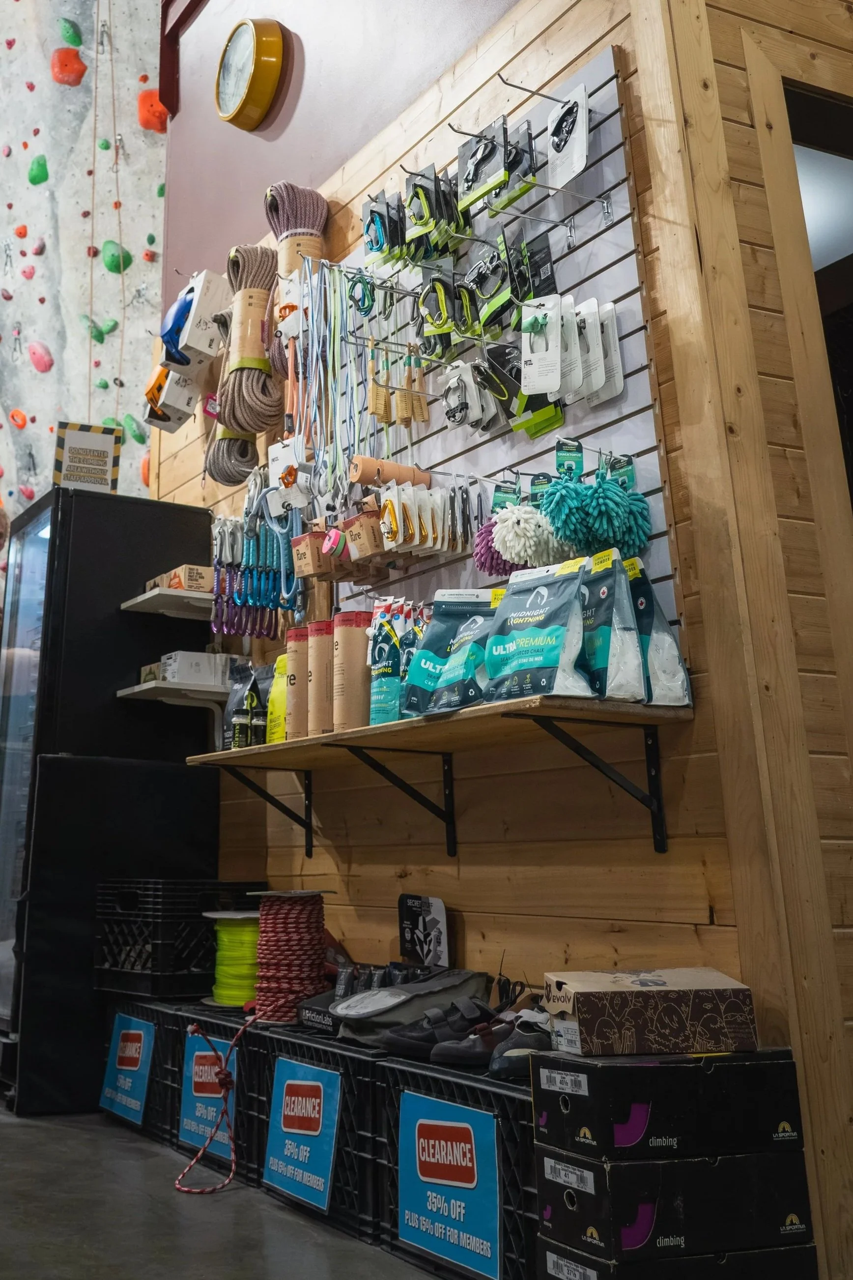 Shoes, harnesses, belay devices, carabiners, ropes, chalk bags, chalk, quickdraws, guidebooks, and more!