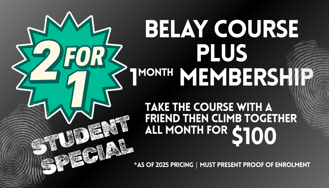Our introductory Belay Course +1mo Membership is already a great value, and we’re currently DOUBLING that value for students enroled in post-secondary education. We want to lower the barrier to entry for students so that you can more easily explore climbing and decide if it’s right for you. So bring a friend, learn the ropes, and climb together for a month, all for $100 total. We think you’ll stick with it ;)